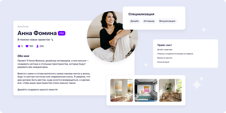 Добавляйте свои лучшие дизайн-проекты, создавайте новые в Мастерской и откликайтесь на заказы Биржи. Развивайте карьеру дизайнера с удобными инструментами платформы.